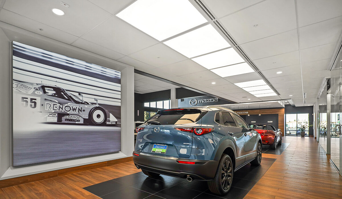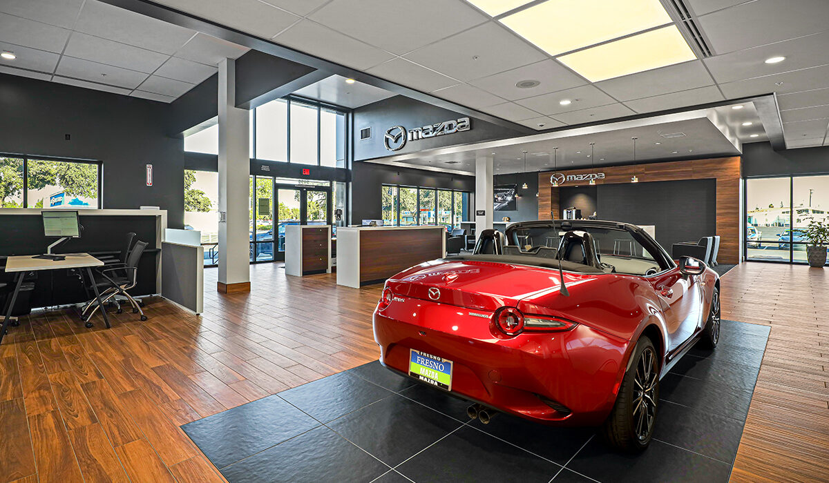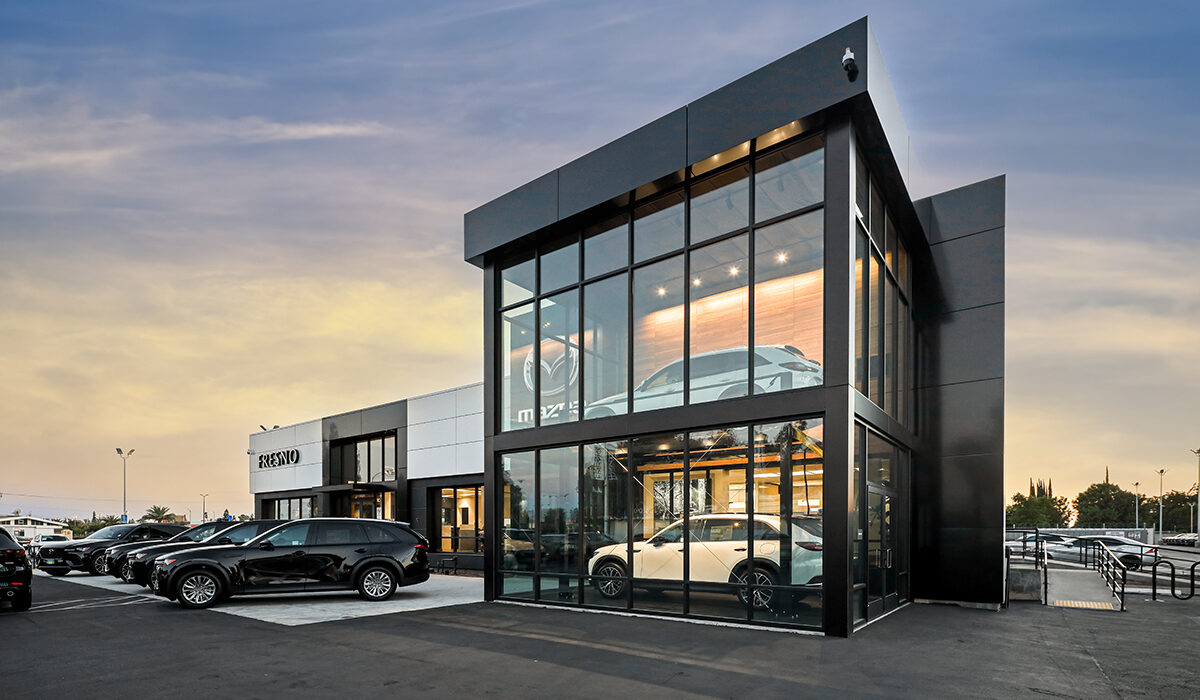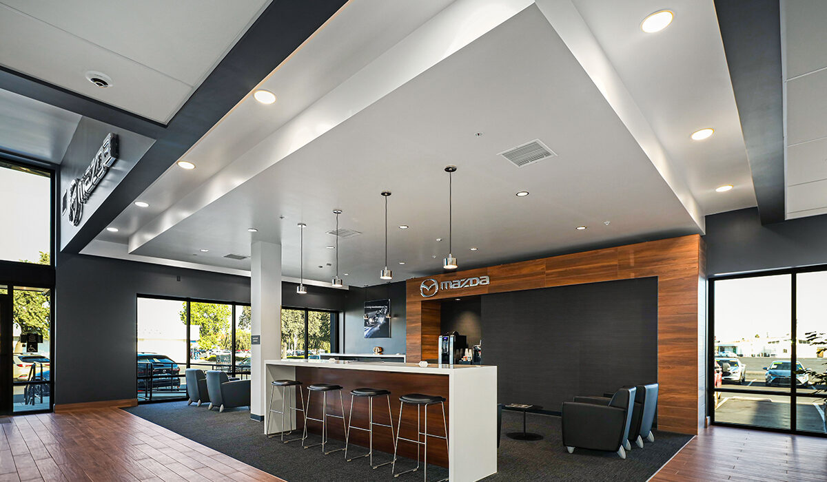 This 33,513-square-foot renovation transformed an existing Subaru dealership into a modern Mazda dealership that reflects the brand’s refined, contemporary identity. The project included extensive exterior and interior upgrades, beginning with a full demolition of existing finishes to create a refreshed showroom, sales offices, customer lounge, training areas, business development offices, service write-up, and parts and merchandise spaces. The interior design combines wood tones, warm grays, and crisp whites to create a clean, inviting atmosphere. Exterior improvements feature ACM panels in contrasting black and white with gray stucco accents, complemented by expansive, black-framed storefront glazing that visually connects the sleek architecture to the bright, open interior.